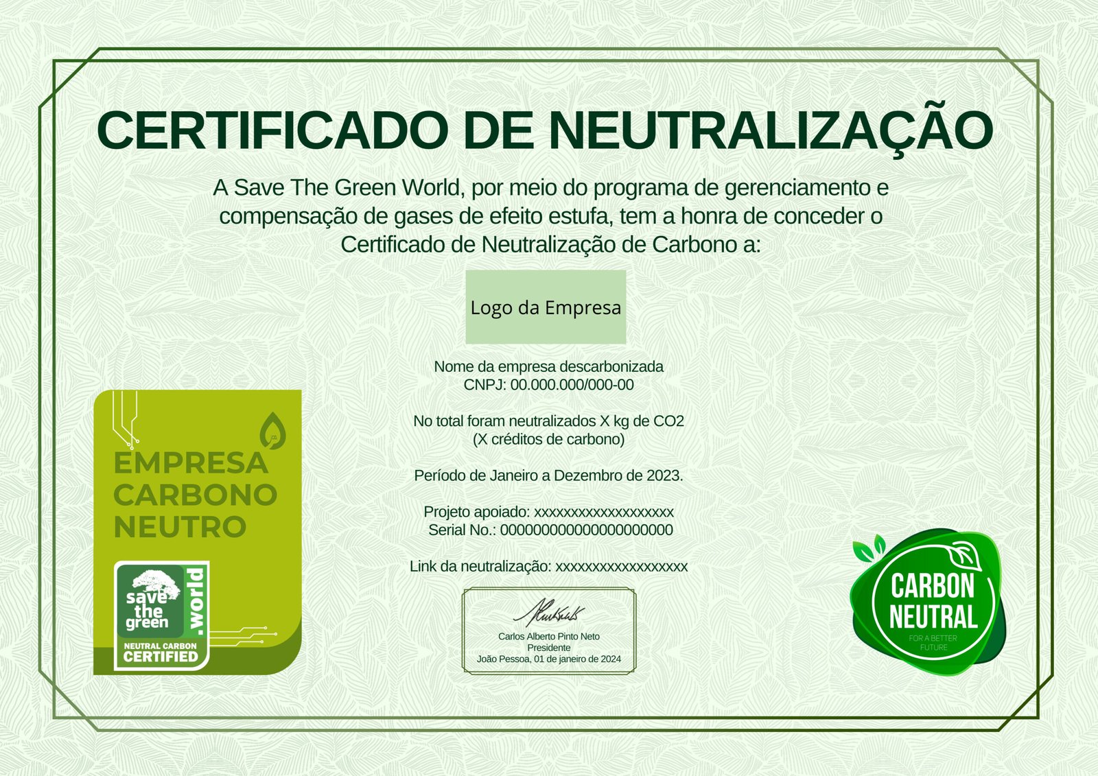 Ao final do processo, você recebe o Certificado Carbono Neutro da SaveTheGreen. Este certificado, que pode ser referente a um trimestre, um ano de uma empresa, um dia de evento, etc., é válido para todo o período que foi neutralizado.